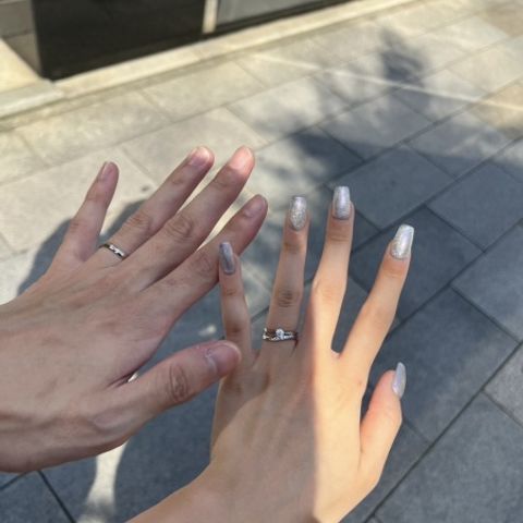 ダイヤモンドの輝きが暗いところでも綺麗に光り、光に当たるとどの角度から見ても価格以上の輝きです。重ね付けをしてもダイヤモンドの主張も強くなく、理想通りの指輪になりました。旦那の方はマット加工をしてより普段使いしやすいデザインになりました。