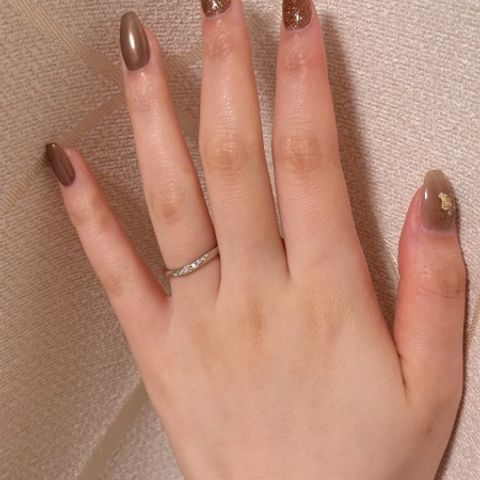 最初は長く使うものだからと、ダイヤ付きにするか迷っていましたが、こちらを着用した時に、たくさんダイヤはついているけれど、ギラギラしすぎず、ちょうどいいリングの細さで手が長く綺麗に見えたため、即決しました。
