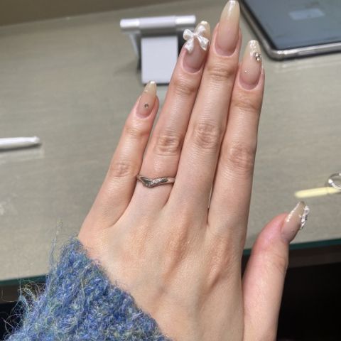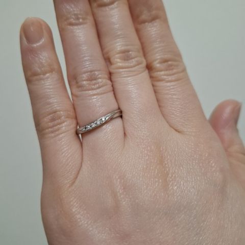 指の形や細さからVラインやウェーブのデザインが似合うとアドバイスいただきこちらを選びました。重ね付けもできるのでその天も気に入っています。 控えめなサイズのジュエリーが良かったので、その希望も叶い理想的な指輪に出会えました。