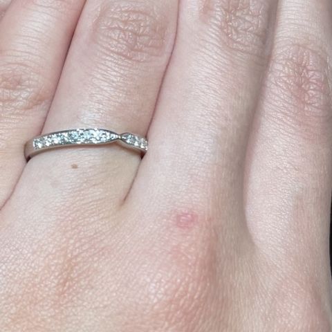 とてもシンプルでかつ、ささやかな感じでダイヤが煌めいている指輪で気に入っています。婚約指輪他の重ね付けをすると、なんと華やかなことか。特別感を演出してくれます。日常的にもつけやすいです。彼とのデザインの合わせもとてもいいなと思いました。