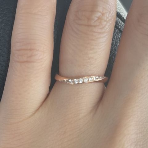 細身のデザインで中央にキラキラしたダイヤモンドがついていてシンプルなのに可愛い。ストレートタイプではなカーブしたデザインになってるので婚約指輪とも合っていてとってもお気に入りです。とても気にっています。