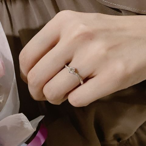 薬指に馴染む右右上がりの緩やかな捻じれと、清潔感のある浅い溝、また細い指にもぴったりと合うプラチナの輝き、さらにそれに遅れを取らず、かつ主張しすぎないダイヤモンドのバランスが絶妙でした。 受け取ってくれた相手の指にもとてもよく似合いました。