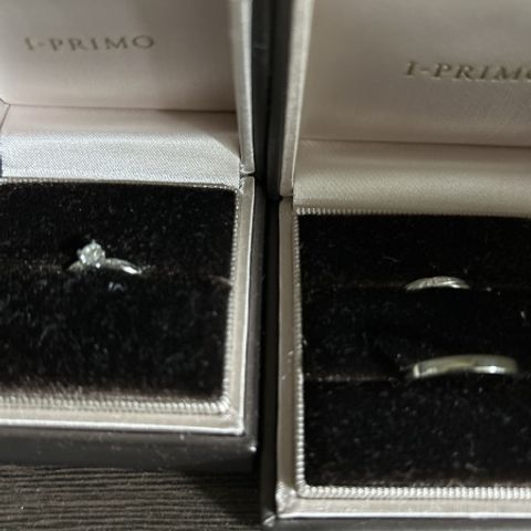 婚約指輪→一粒石か、3連のものにするか迷いましたが、一粒石のものにしました。3連のものだと、キラキラ具合は良かったのですが、やはり飽きのこないベーシッ クなデザインなものが良かったのと、一粒石の方が、カジュアルすぎない感じが良かったです。 結婚指輪→パートナーとお揃いのデザインがよく、お揃いのものがあるものを購入しました。私のはダイヤが斜めに入っているデザインで、パートナーのものは、ダイ ヤは入っておりませんが、斜めにラインが入っていて、そこの境目でリバーシブルデザイン、普通のシルバーと、マットデザインのもので、日によって変えられるのが 良かったです。