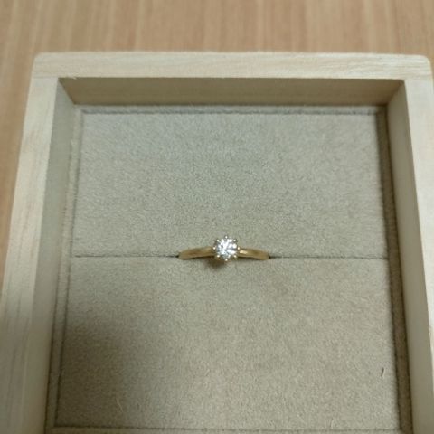 私の指が細すぎて追加料金(+5500)かかりましたが、可愛く仕上がって大満足です。リング本体はイエローゴールドですかま、台座がプラチナで石も綺麗に見えます。箱も可愛いので、このままリングピロー代わりに使おうと思います。