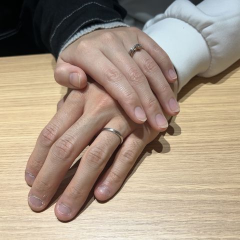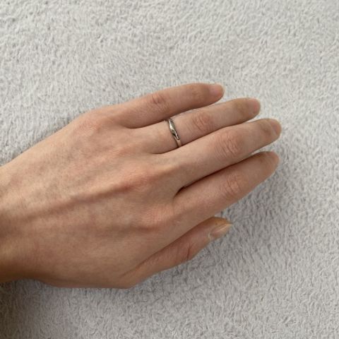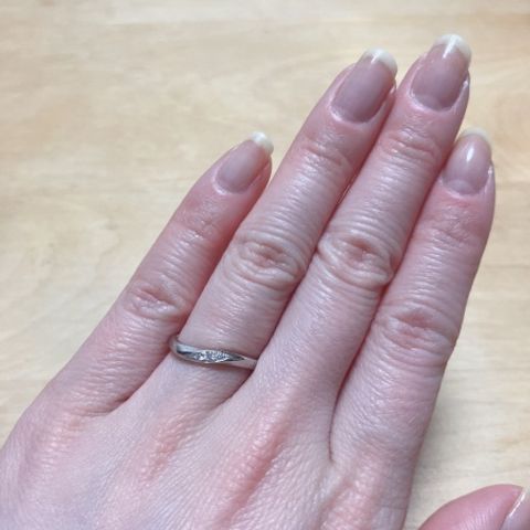 ストレートではなく少し曲がっているデザインのものを選びました。シンプルだけど手が綺麗に見えて、とてもおすすめです。女性はダイヤモンドがついているタイプの結婚指輪もありますがあえてダイヤモンドがついていないものを選びました。この指輪はどんなファッションにも合います!