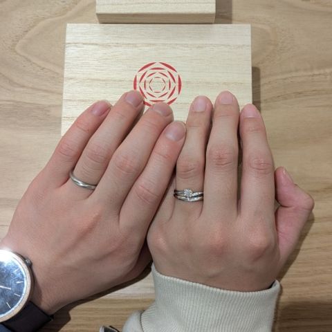 自分たちが好きなデザインを店員さんと相談しながら決められたので、自分たちらしさやつけ心地など、満足しています。重ね付けすることを想定して作ったので、重ね付けしたときの見た目も気に入っています。飽きが来ないデザインにしたので、一生物としてとても良い指輪が出来て満足しています。