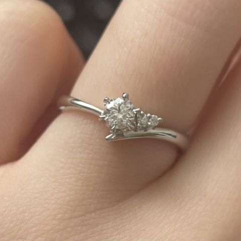 ダイヤがメインとその両サイドについているというデザインが可愛くてとても気に入っています。 どの角度から見ても中央のダイヤはきらきらと輝くので手先が華やかになります。 少しウェーブがかったデザインも、指を綺麗に魅せてくれます。