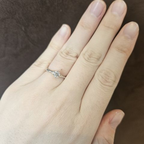 シンプルかつダイヤモンドの輝きを引き立たせてくれるような魅力があるように感じました。 特別感があり、とても素敵な仕上がりです。 結婚指輪とのセットリングにも、一本使いにもできる、使い勝手の良いデザインです。