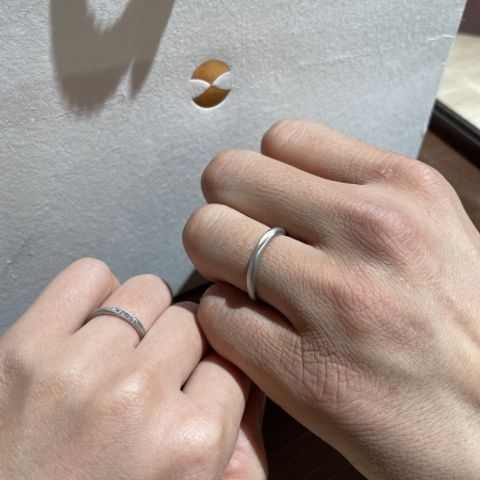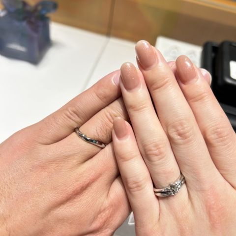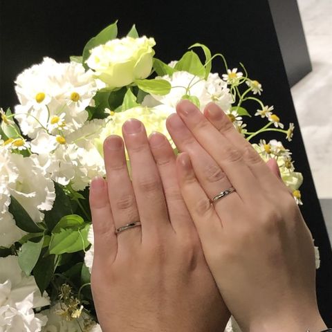シンプルなのにオシャレなことに加え、パッと見た時に指輪の輝きが分かるところがお気に入りのポイントです!男性側の指輪も少しウェーブなデザインが入っていて、さり気ないオシャレで素敵です!仕事場でも気にせず付けられるので嬉しいです!