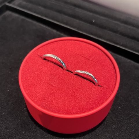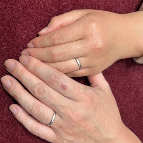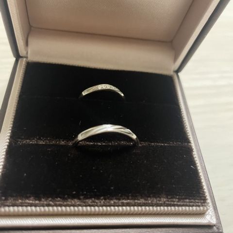 エンゲージリングは、左右非対称なので逆さまにつけても印象が変わるのと、ダイヤモンドになるべく高さが出ないように作られているので、ゴツくならずに綺麗に見えます。 マリッジリングは、小さいダイヤがカーブするように付いているので、着用したときに正面だけでなく奥から見ても手前から見てもキラキラとしていて綺麗です。 男性用のマリッジリングも、マット加工をしてもらい、少し個性をもたせられたのが嬉しかったです。