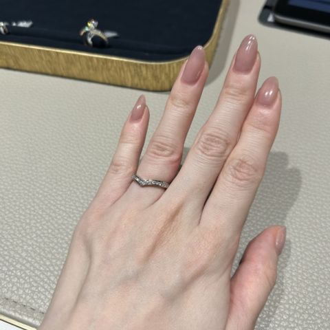 V字になっており、指が細長くきれいに見えた。 店舗の証明で見るとキラキラ感があり、キラキラ過ぎないか心配でしたが、自然光でつけてみると思っていたよりキラキラ感が強すぎず個人的に素敵だと思った。 ミル打ち加工がとても素敵だった。