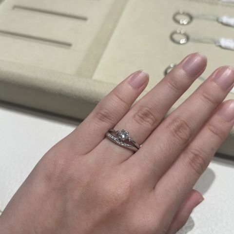婚約指輪と重ね付けがしたいと思い、店員さんと相談した上でフィットするV字型デザインの結婚指輪にしました!! 婚約指輪と付けても良し、結婚指輪だけでも見る度に惚れ惚れするようなキラキラ感でとても満足しています!