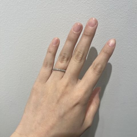 同ブランドの別シリーズの婚約指輪(フラワーサークル)と重ね付けをする前提で選びました。ダイヤに光が入ってキラキラ輝くところがポイントです。ダイヤが引っかかりやすいので日常使いには不向きかもしれませんが、仕事中はつけないので、せっかくなら華やかにしたいと思い、このデザインにしました。