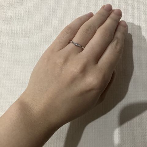 Vタイプで指が長く見えることと、重ね付けした際のシルエットもとても綺麗だった。 脇石が2つずつ着いており、寂しくもなく主張しすぎず、センターのダイヤがより輝いて見える。 ダイヤのサイズは0.25cでそこまで大きいものではなかったが、とても大きく感じ満足でした。