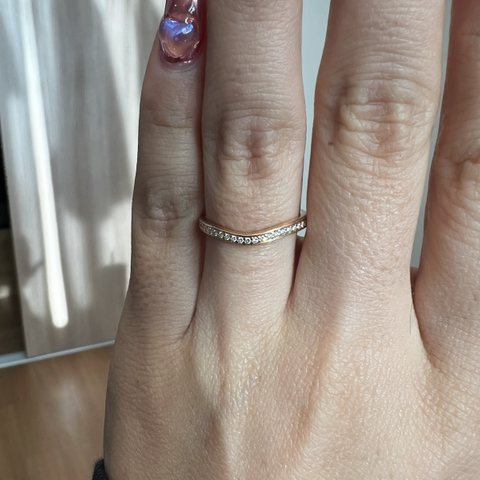 付け心地がとても良く感動しました。ダイヤが目立って重ねつけした時に浮いてしまうのが嫌だなと思っていたのでちょうど良かったです。結婚指輪が他のブランドで欲しいものが決まっていたので重ね付けした時に、膝下フィットするのもすごくお気に入りのポイントです。