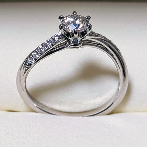 実際に色々試着させていただいて付け心地の良さやデザインが気に入りました。シンプルですが、横から見た時のデザインが可愛くてどんな結婚指輪とも合って重ね付けできるのでおすすめです。王道の婚約指輪!という感じです。