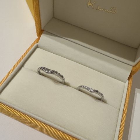 シンプルなデザインでいつでも着けられるようなものを選びました。少しウェーブがかかっており指がすっきりと綺麗に見えるとのことで気に入ってます。年齢を重ねても着けられるようなデザインであることも私たちにとってはグッドポイントとなってます。
