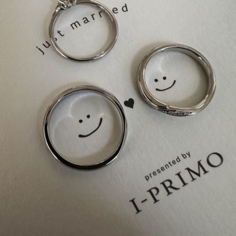 指輪は主人のも私のもホワイトゴールドで、主人は王道のシンプル、私のはダイヤが入ったものになります。重ね付けしたかったのと、普段から常に付けていられるもので選んだため、服装も選ばず、どのシーンにも使用できます。