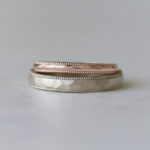 色違い、太さ違いですが、どこかリンクしたデザインでお洒落なペアリングという感じです。 ざらっとしたマットな質感にも見えますが、滑らかで品のある美しさがあります。 夫婦二人の意見が他の指輪だと噛み合いませんでしたが、こちらの指輪は合致しました。 男女問わず好まれるデザインだと思います。 実際に実物を拝見して、特徴であるホワイトゴールドの美しさ、独特の太さや質感により惹かれました。