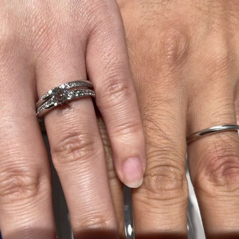 シンプルなデザインながらもゴージャスさもありデザインが凄く好きでした。 今回婚約指輪と結婚指輪を一緒に選んだので、その2つの指輪の重なりの着け心地やデザイン性、夫婦で合わせた時にも合う指輪と出会えて嬉しかったです。
