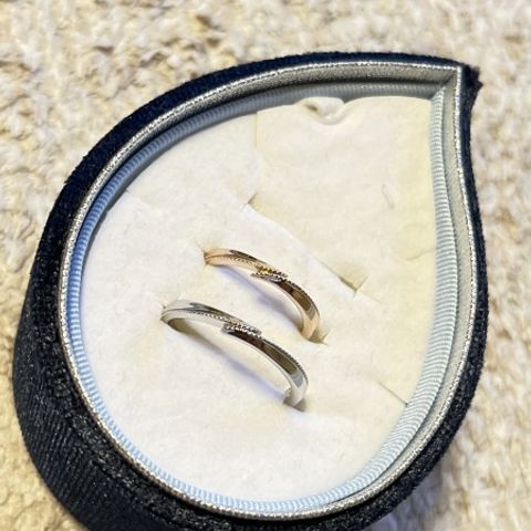 女性側の結婚指輪にはダイヤモンドが敷き詰められていて、可愛い でも華美すぎず、日常使いできる! ダイヤモンドが出っ張っておらず、毎日つけていても引っかからない。 男女ともにシンプルだけれど、ねじれのデザインが可愛い。