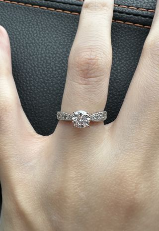 カラット、カラーなどお店の方と相談して決めました。購入し、着けてみるとキラキラと輝き、大きさ(0.5カラット)も存在感があり手とのバランスがとても良いです。手が大きいため、このサイズにしましたが良かったです。