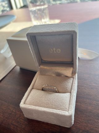 シンプルで見た目もオシャレで重ね付けもしやすい。 婚約指輪は、普段つけないイメージも多いがこれならずっと付けれる。デザインがどの指輪ともあうので、重ね付けした際により一層指輪が強調されてとても良いと思う。