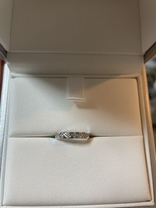 素材はプラチナ950です。ダイヤがたくさんついているので、扱いにくいかと思いましたが、思ったよりも手に馴染んでくれて使いやすいです。同じ種類の婚約指輪とも相性バッチリですごくかわいいです。ただ、ダイヤをつけている爪の部分がたまに服の繊維を引っ掛けてしまうので気をつけたいと思います。