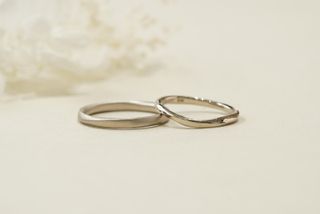 シンプルなデザインでありつつも女性リングは片面にメレダイヤモンドが埋め込まれており、豪華さもある。 男性リングはストレートの形に真ん中が絞られているデザインで動きがありシンプルすぎない 形はストレートではあるが動きのあるようなデザインの為 ウェーブがかったようにも見えて色んな指タイプでも合うと思う