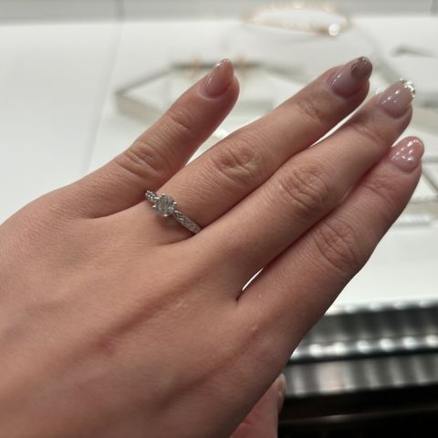 とにかく可愛いです!ダイヤモンドは0.4カラットですが土台が大きく見せてくれるところもおすすめです!シンプルにダイヤモンドひとつでも可愛いですが、小さなダイヤモンドが横につくだけでさらに可愛くなります!