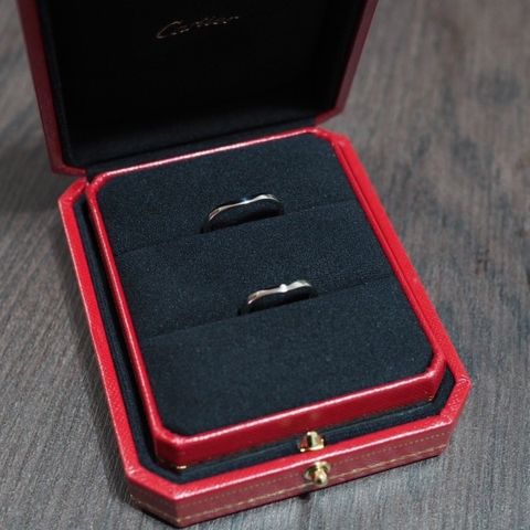 シンプルなデザインで煌びやか、カットのデザインが特徴的なところが決め手でした。普段着用もしやすい。ピンクゴールドとシルバーという違うカラーにしましたが、デザインの統一感がありペアっぽさが出るところも気に入っています。