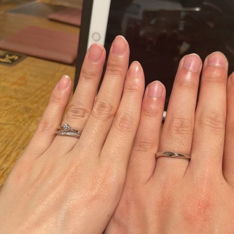 シンプルかつ、結婚指輪の購入を考えているため重ねてつけても違和感がないところに魅力です。色々試しにつけさせてもらいましたが、なんとなくでも自分がしっくりくるものがいいとお店の方もおっしゃっていたので、お気に入りのものを見つけられてよかったです。