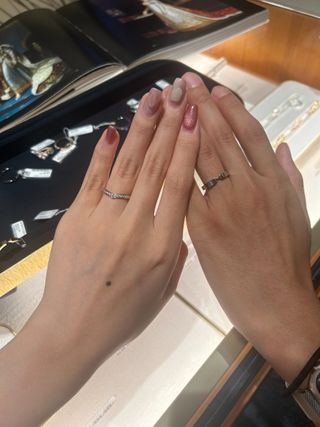 色々な店舗を回りましたが、その中でも婚約指輪に合う可愛いデザインの結婚指輪を見つけることができました。他のハイブランドに比べると価格も抑えられて良かったです。婚約指輪の存在も残しつつ周りでキラキラ輝いてくれている結婚指輪がとてもお気に入りです。