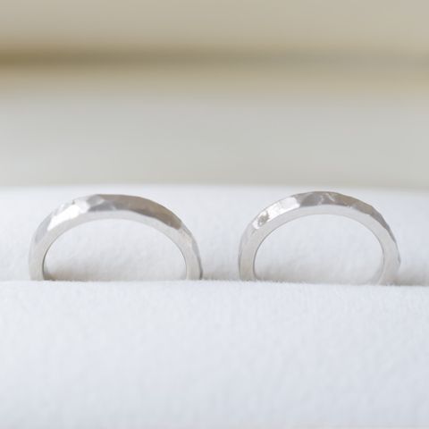 デザインは元々欲していた槌目のデザインにしました。 価格は一般的な結婚指輪とは違い非常にお財布に優しいかと思います。 サンプルもたくさんある中から実際に色々つけさせ頂けましたので、安心してデザインや号数などを決定することが出来ました。