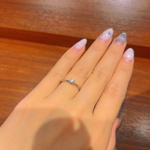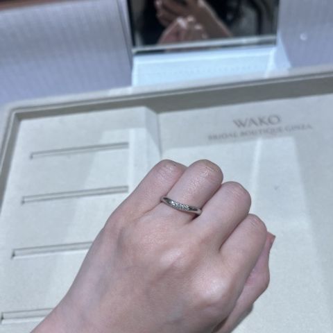 試着させて頂いた指輪の中でも細身で、着け心地が良いところを重視して選びました。デザインもシンプルなところがとても気に入っています。また、細かいダイヤがさりげなく入っていて、ふとした瞬間に輝くので、とても素敵です。