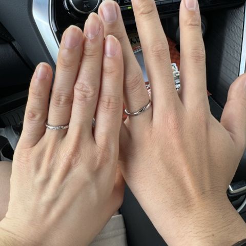 婚約指輪と重ね付けできること、着け心地がいいことを重視して選びました。私の指輪にはダイヤが斜めに入っていて、ちょうど婚約指輪のダイヤの位置にくるのがポイントです!彼の指輪はツヤケシをしてもらいました。 私の指輪のダイヤが入っている位置と同じなのでペア感が強調されているのが推しポイントです!