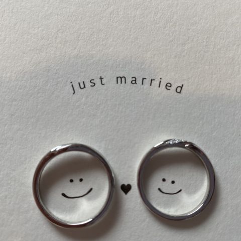 シンプルですが、セミオーダーでダイヤを3つ溜めたので手元で輝いています!内側の刻印は2つ重ねたら絵が浮かび上がるようにオーダーしました!また、婚約指輪と同じシリーズにしたため重ね付けした時に統一感があり、気に入っています!