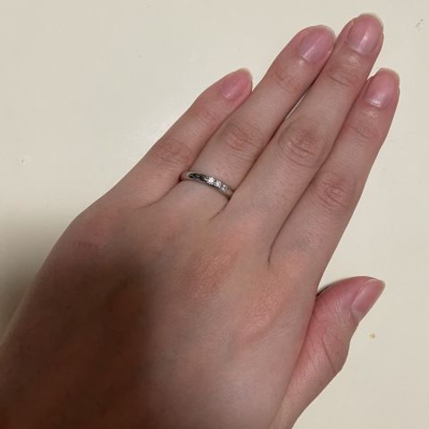 自分の指に合っているなと思って、ほぼ一目惚れだった。ダイヤが相手見えるセッティングの仕方とデザインが気に入った。自分からも人からも綺麗に見えると思ったのも気に入った。ハーフエタニティに憧れがあって、ダイヤも綺麗だったのですごくよかった。