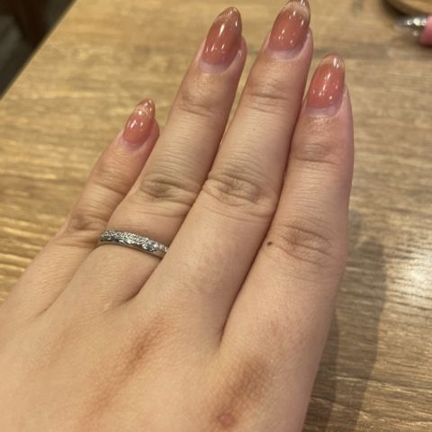 婚約指輪ですが、結婚指輪と重ね付けでき、また、普段使いもできるようにとエタニティのリングにしました。ハーフエタニティですが、ダイヤを追加することができ、見た目はもちろん、サイズ調整にも対応できるようにしていただけたのがありがたかったです。