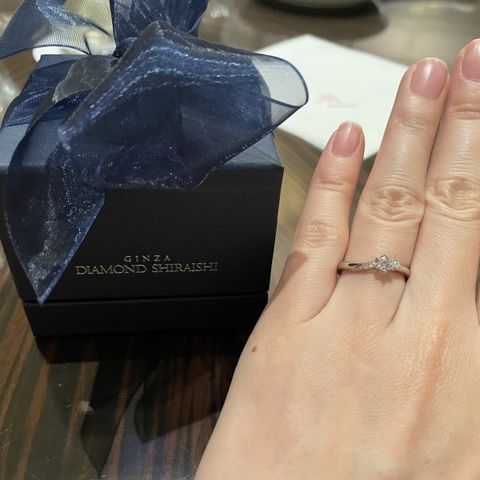 旦那さんがサプライズでプロポーズしてくれた際にもらいました。指輪のデザインでおすすめなポイントは、華奢なデザインだけど存在感がある形がお気に入りです。少しウェーブがかった形なのですが、結婚指輪と重ね付けできるのがお気に入りです。