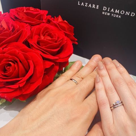 結婚指輪のデザインは小粒の装飾が5つあって、どちらかと言えばキュートな感じ、婚約指輪とセットでつけた時に特にキラキラダイヤモンドの輝きが美しくて、一目惚れしました。 相手のもシンプルなものを探していて、装飾がなく一筋溝があってマットな加工がされてありどちらもたいへん気に入ってます