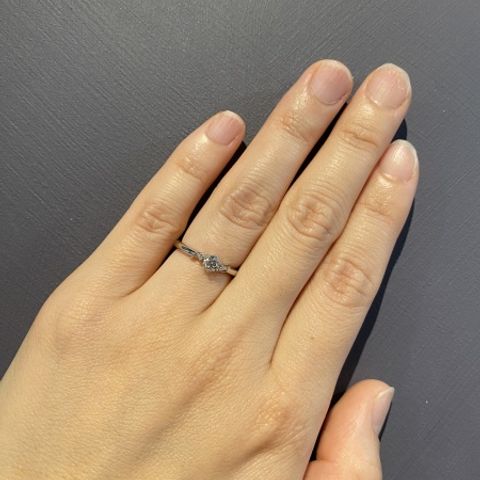 シンプルで普段使いもできて素敵です。何より横から見た台座のデザインがシンプルなのにおしゃれでダイヤを際立たせるデザインで一目惚れしました。 自分は指が太めなので細いデザインが似合わないと思っていたのですが試着してみたらしっくりきたので、シンプルで誰にでも似合いそうだと思いました。