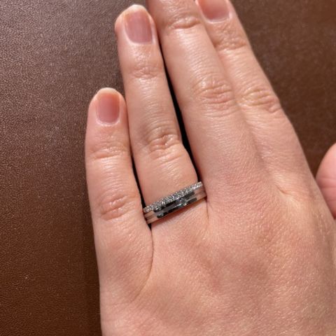 なめらかなウェーブラインの中に無数に輝くダイヤモンドが華やかで素敵なデザインの指輪です。メンズデザインもウェーブラインが指を綺麗に魅せてくれて、つや消しでかっこよくてお気に入りです。着け心地もとてもよく今後何十年とはめるなら着け心地はとても大切だと思うのでこの指輪を選び良かったです。