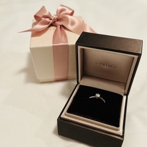シンプルで飽きがこなさそうなデザイン、比較的どんな結婚指輪と重ね付けしても綺麗に見えそうなものを選びました。写真には載せていませんが、横から見た時ダイヤの形が綺麗に見える留め金の流線が綺麗で、とても気に入っています。ぜひI-PRIMOさんのサイトでもチェックしてみてください!