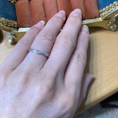 婚約指輪と重ね付けできるようにシンプルにしました。 いろんな形があって何度も試着したけどやっぱり一番初めに選んだやつが一番お気に入りでそれを購入しました。結婚指輪だけ付けるのであれば他の形でもいいと思う。