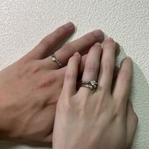 2人で考えたデザインが、2つの指輪で初めて完成されるところが2人の絆を感じられて素敵だと思います。 指輪も滑らかでツルツルした加工もお気に入りです。 サンプルにもない私たちのオリジナルのデザインがしっかりと反映されていてたった一つの大切なものとなりました。