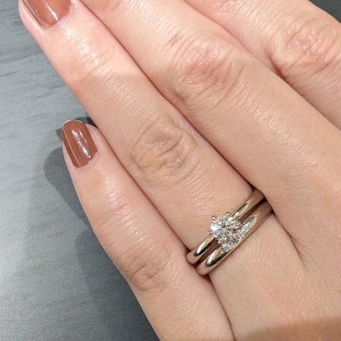 重ね付けできることを重視して、ペアリングにとらわれず多くの指輪を試着しました。デザインは、王道の1粒ダイヤで、ねじりのある分指が綺麗に見てるものでした。ダイヤモンドもカラットやクラリティーの違いを実際に見て、満足できるものを購入することが出来ました。