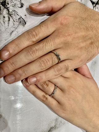 指輪のデザインも素敵でした。ウェーブが掛かっており、男用には艶消しのデザインもかっこよかった。女用にはダイヤも目立ち過ぎない程度に程よく散りばめられており綺麗だった。婚約指輪との重ね付けもやりやすいデザインだった。