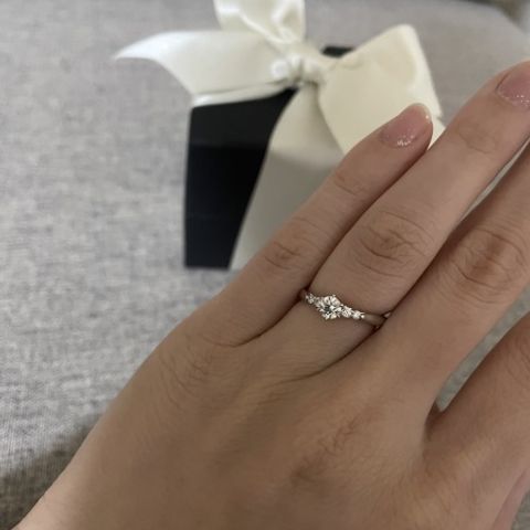 軽くて付け心地がすっごく良いです! 元々婚約指輪はゴージャスなものよりシンプルなものが欲しいと思っていたのですが、一粒ダイヤだけだとなんかちょっと寂しいという方にすごくおすすめのデザインです。 結婚指輪との重ね付けにもすごく憧れがあったので、重ねたときに違和感がないようにしたくて、先に結婚指輪を購入してから、婚約指輪を選ばせてもらいました。