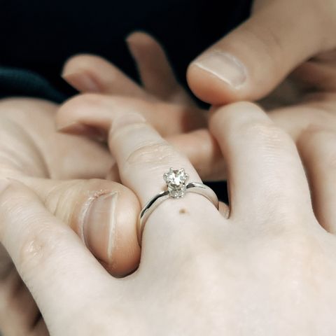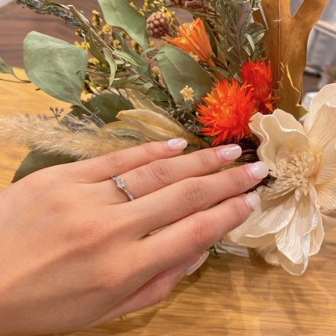 指輪はシンプルな物がタイプなので、おばあちゃんになっても着けれるような指輪を探していました。もともとサイトから知っていましたが、実物をお店で見たときはすぐ気に入りました。煌めくダイヤの見せ方が美しかったです。シンプルなので、どんな服装にも合うと思っています。そして結婚指輪も同じブランドなので重ね付けの見た目も気にして購入しました。